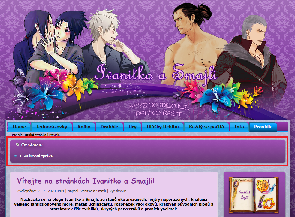 Nacházíte se na blogu Ivanitko a Smajli, ze stenů uke zrozených, hejtry neporažených, khaleesi velkého fanfictionového moře, matek uchihacestu, rozbíječek yaoi okovů, královen původních blogů a protektorek říše zvrhlíků, skrytých perverzáků a prvních yaoistek.